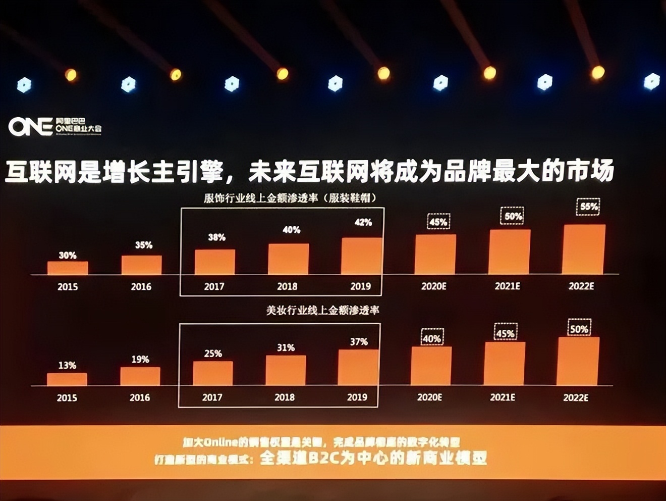 而根据阿里巴巴提供的数据,服饰行业线上金额渗透率将持续提升,在2022年时将达到55%。