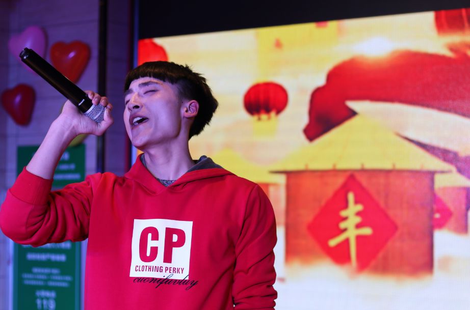 丰产路店的主管小哥哥,脱下工装,换上喜庆的大红色卫衣、卫裤、白色滑板鞋,真是时尚时尚最时尚!一出场,单凭这颜值就获得满场的欢呼。一首《红包》刚开嗓,分分钟圈粉台下的少女们。