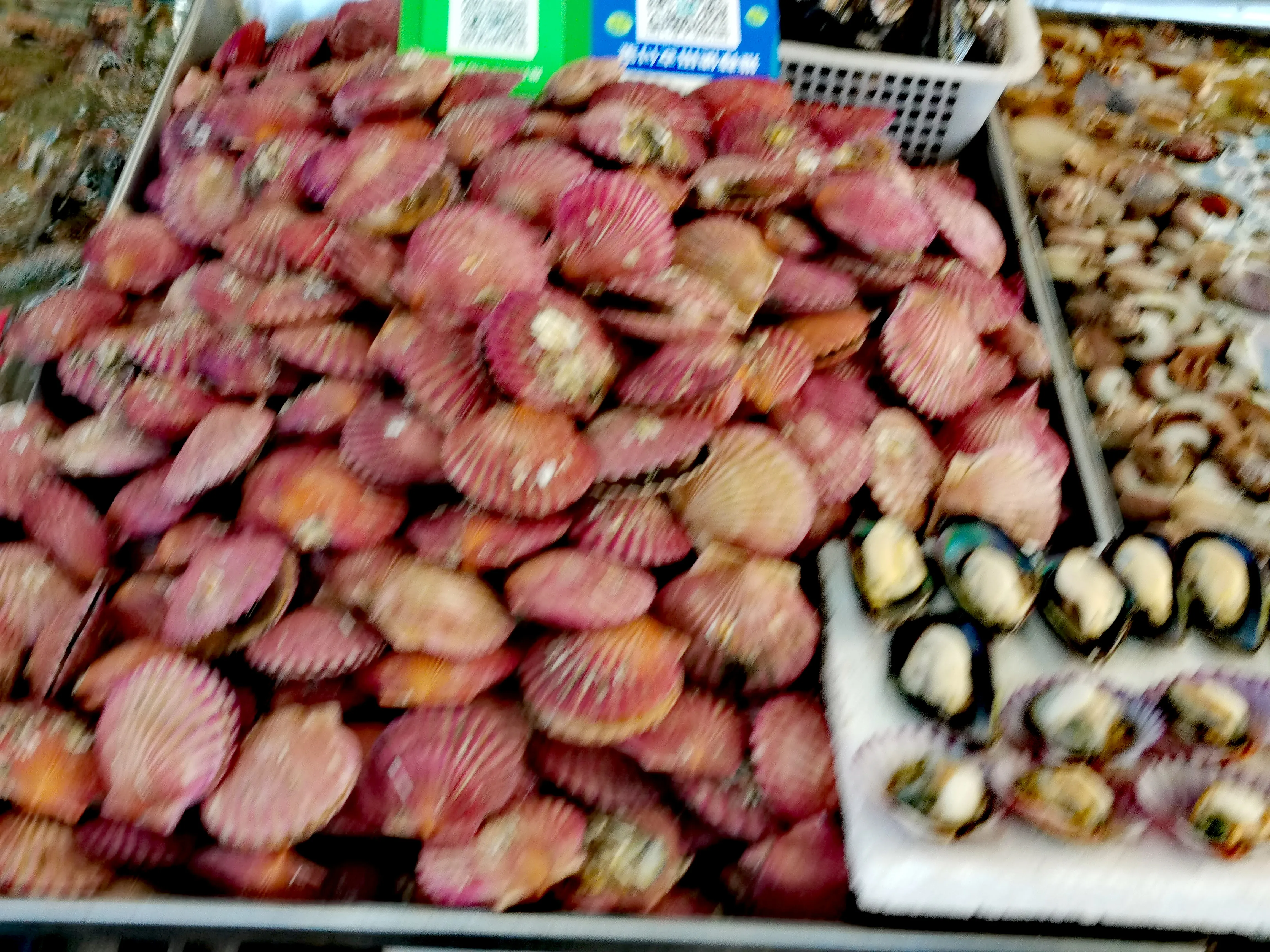 这个市场真是名副其实啊,卖蔬菜的、水果的、海鲜的、猪肉羊肉鸡肉的、干果调料的、米面粮油的、馒头面包小吃的……数不胜数,一条街一个产品,井然有序,尤其各种海鲜鱼类让我这个西北人大开眼界,活蹦乱跳的大螃蟹,大虾,叫不上名字的鱼,奇形怪状的贝类……哇塞!好丰富啊,再看价格,也便宜的出奇,在西安螃蟹可是论个卖的,这里一斤三四十元,新鲜出海的带鱼才买5.5元一斤,西安最便宜也要十五元左右,大哥买了三四十个螃蟹,我买了七八斤带鱼,我最喜油煎的带鱼,这下可要好好的过把瘾了!
